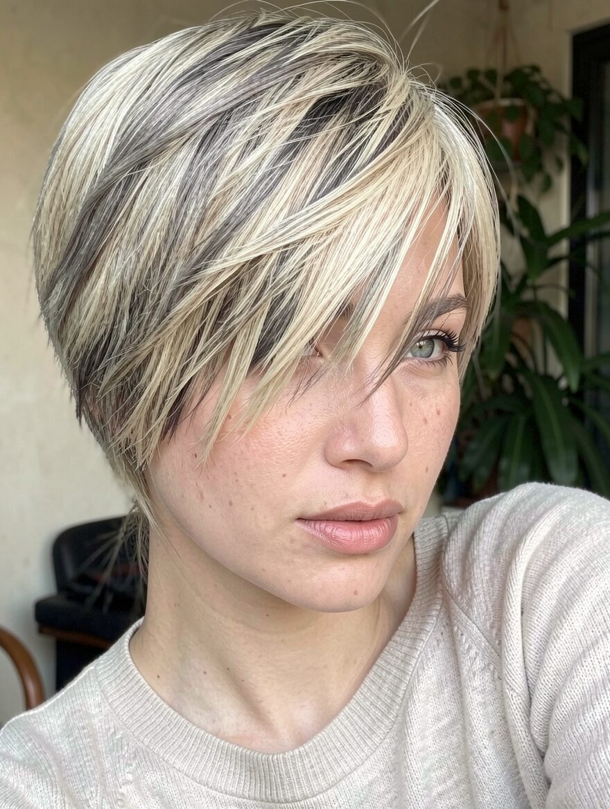 This diffused blonde color is the perfect way to highlight a shaggy, tousled cut that's somewhere between poker straight hair and the perfectly polished waves. With blonde color beginning fairly high up towards the roots, highlighted bangs make for a big impact, and you should carefully choose your shade according to your complexion.