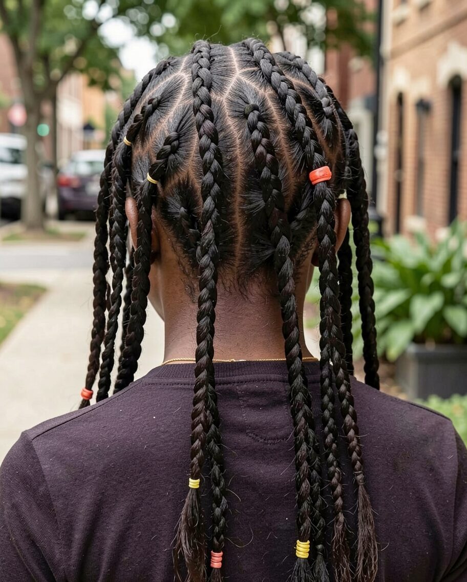 These long cornrow braids look even more stunning with baby hair and golden hair strings.