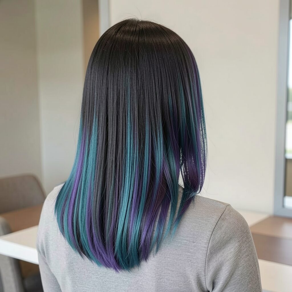 Peekaboo highlights can be applied in a number of different ways, and this steep a-line bob uses a technique where panels of a highlight color are applied to hair's underneath layers. Compared to smaller sections of peekaboo shades that may often be completely hidden, panels create a big impact and are especially great for layered bob haircuts.