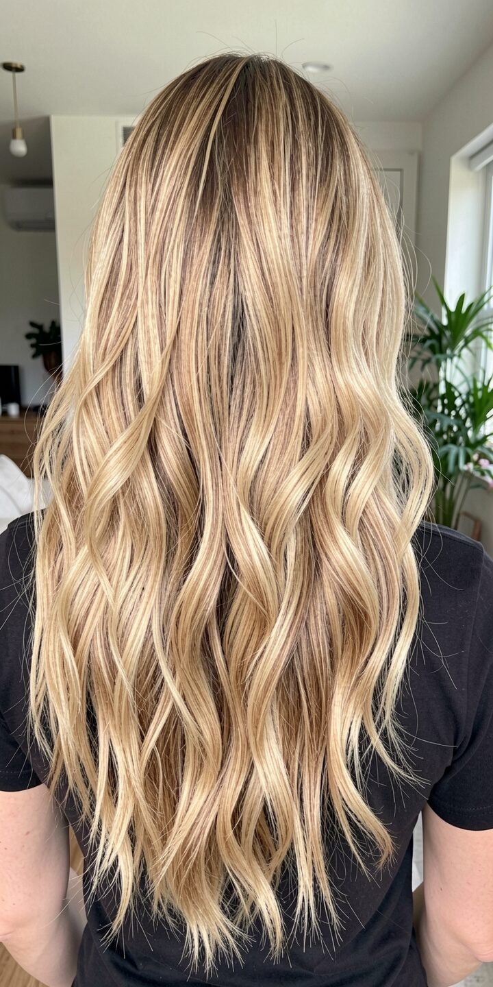 With a buttery blonde balayage applied liberally over darker blonde hair, this hairstyle strikes the perfect balance between trendy and natural looking.