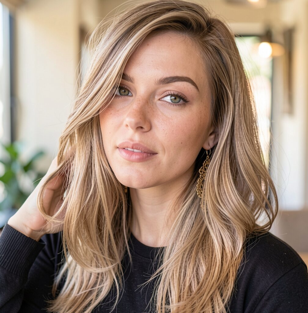 How stunning is this blonde hair?! Strawberry blonde is one of the forgotten shades of blonde. Have you noticed? We’re all about bringing the strawberry hue back into the blonde world. This is a darker version strawberry blonde, while maintaining the pink undertone throughout the hair color. Great for a warm, subtle blonde hair color!
