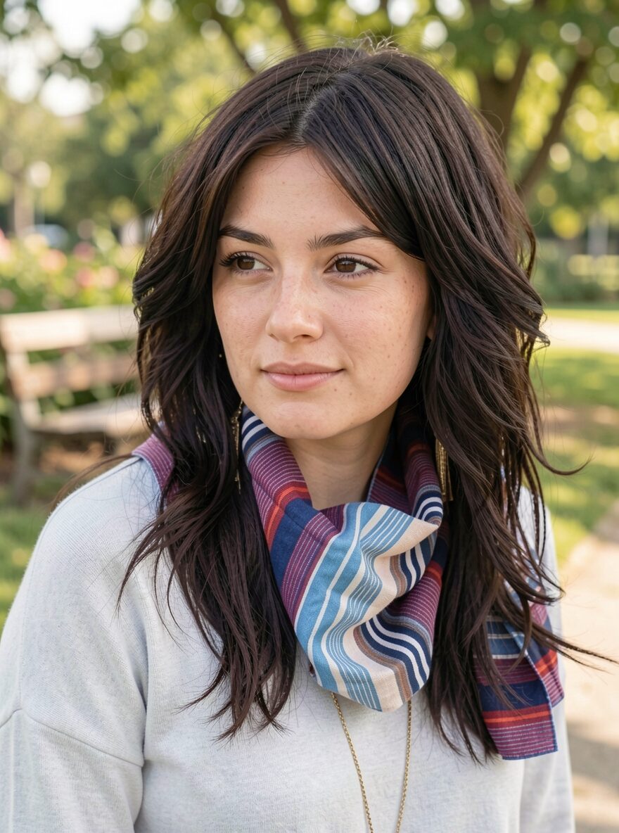 With '70s hairstyle staples like shaggy layers, flicked styling, and a centre part, this long cut looks surprisingly fresh and modern.