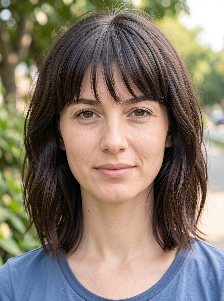 Spunky was the first word that came to our mind when we stumbled upon this haircut. It’s fun, stylish and, well…spunky! Bangs, layers and a medium lob length are a winning combination.