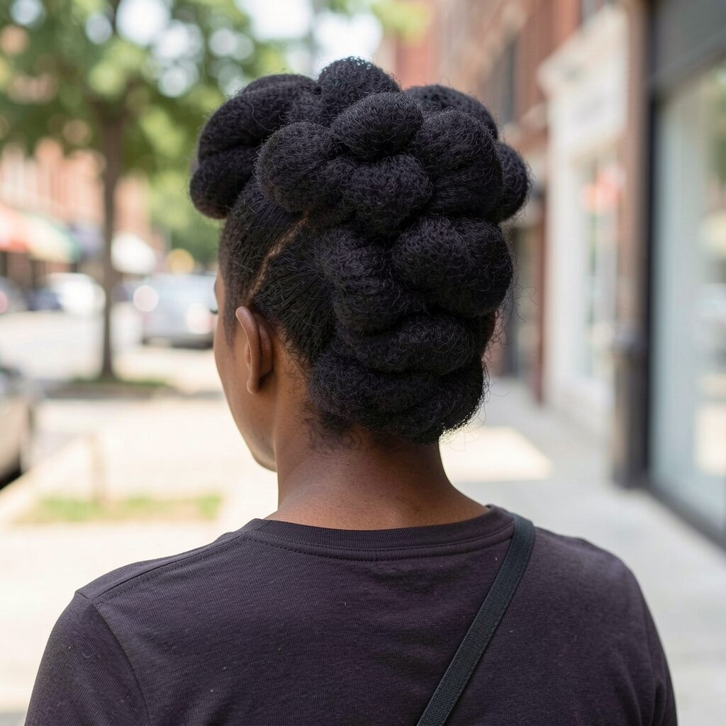 This is the perfect natural hair bridal updo. Side swept bangs and sleek sides make this style very elegant. The twists that are pinned flat to the hair along the part is a way to add your own signature on a style.