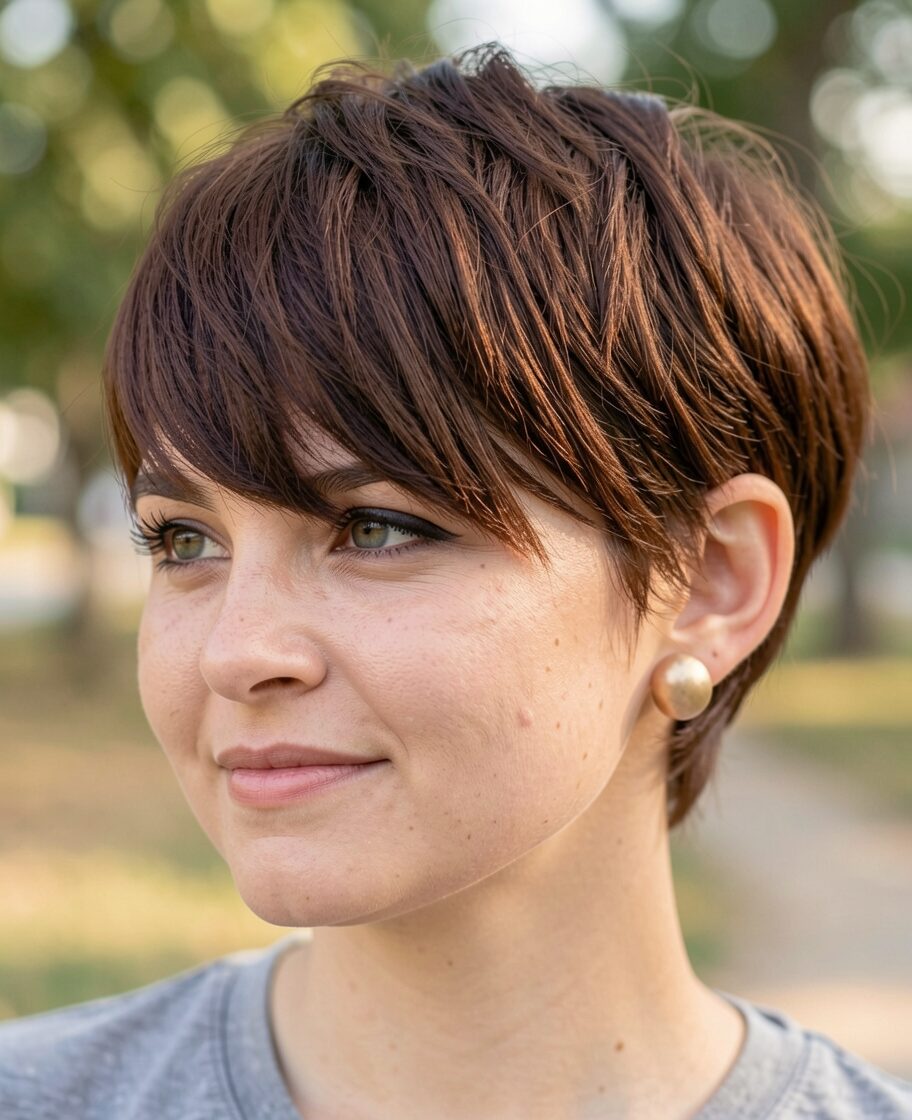 If you have a round face, there are two types of pixie haircuts that are extremely flattering on your face. The first is a graduated pixie cut with side swept bangs. The graduated pixie cut is a great choice for you because the graduated layers help to create angles and volume on the top of your head. The angles, volume, and side swept bangs help to balance out the roundness of your face and create a polished look. The second most flattering pixie hair look for round faces is the pompadour style. This style usually has shorter, or shaved sides, and longer hair that is teased and swept back across the crown. This haircut lengthens your face which helps to counter the roundness of your jaw line and cheeks.