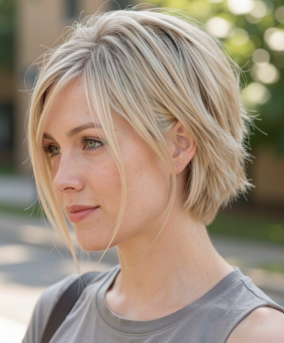 Graduated layers and side swept bangs create a lovely angled pixie cut that is very flattering on all face shapes, but particularly round faces. The graduated layers start shorter at the bottom and get progressively longer towards the top in order to create volume and body. [/vc_column_text][/vc_column][vc_column width=”1/2″][vc_column_text]