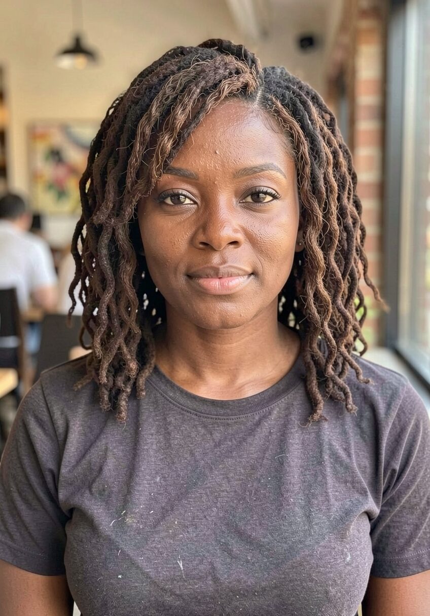 This mostly blunt bob has some texture throughout that makes it manageable even with a thicker head of hair. Long bangs play up hair’s natural thickness and blend seamlessly into the rest of the style, making this one of the most wearable takes on side swept bangs.